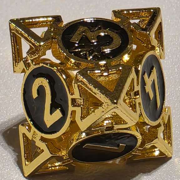 These hollow metal dice feature an open geometric design that feels both intricate and precise — like the framework of a spell waiting to be cast. The metallic structure gives each roll a distinct chime, a subtle echo that draws every player’s attention to the table.