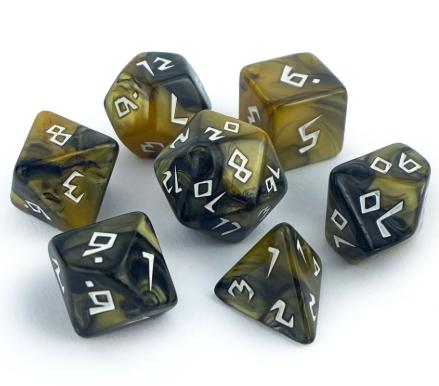 For those who like their rolls to make a statement, the Arcanic Burst collection delivers bold contrasts and striking style. These dice feature opaque bases paired with vivid two-tone color blends, all brought to life with the distinct, arcane-etched font you may recognize from our Pearlspire sets.