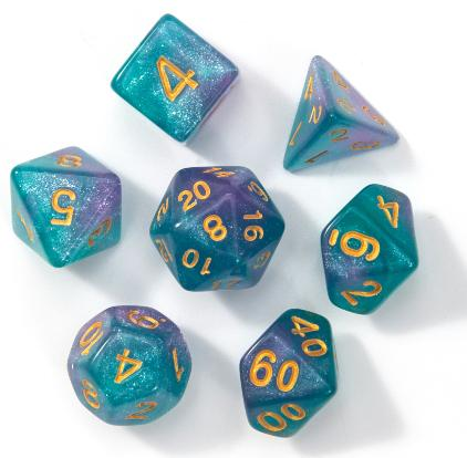 The Celestial Burst Series shimmer like the night sky caught in motion — two hues swirling together in semi-translucent brilliance, with a dusting of glitter that twinkles like distant stars. Eye-catching without being gaudy, these dice bring a touch of the heavens to your table. Perfect for players who want their rolls to shine with just a hint of cosmic flair.