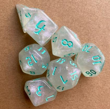 Like starlight caught in freshly fallen snow, the Celestial Frost collection shimmers with quiet beauty. Each set is lightly speckled, semi-transparent, and kissed with a soft frosted finish that makes every roll feel like it came from the heavens themselves. Whether you’re chasing fate among the stars or just hoping your d20 doesn’t betray you again, these dice bring a touch of cosmic calm to every game night.