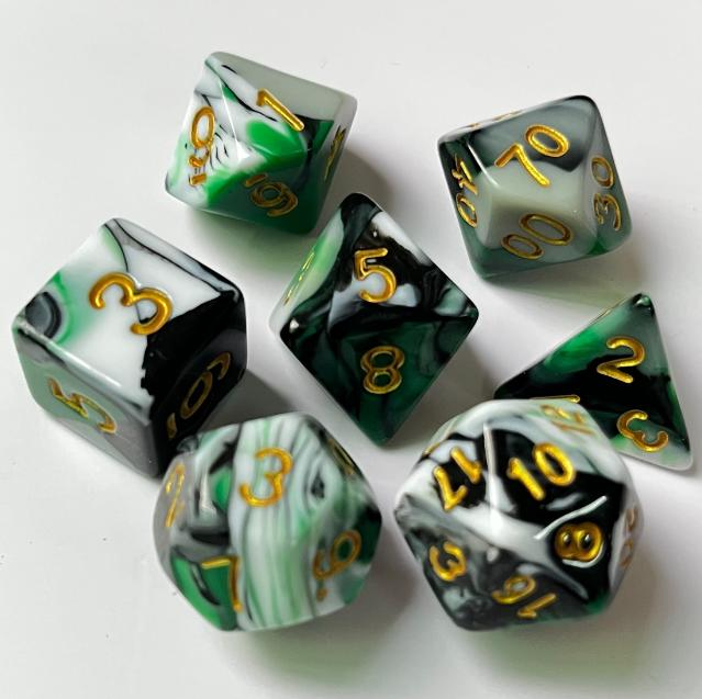 Each set swirls together four distinct colors, blending bold tones into a seamless harmony that feels alive with energy. Whether you’re chasing high rolls or high style, these dice bring personality to every table. Opaque and full of character, they’re the perfect companions for adventurers who love a little unpredictability in their magic.