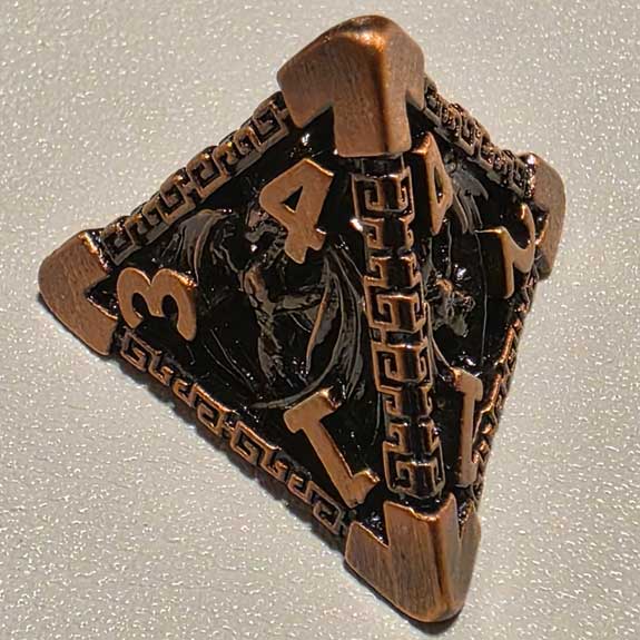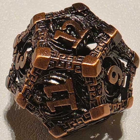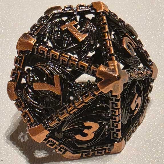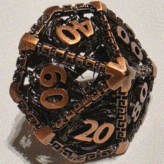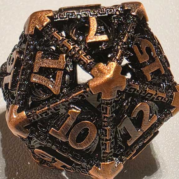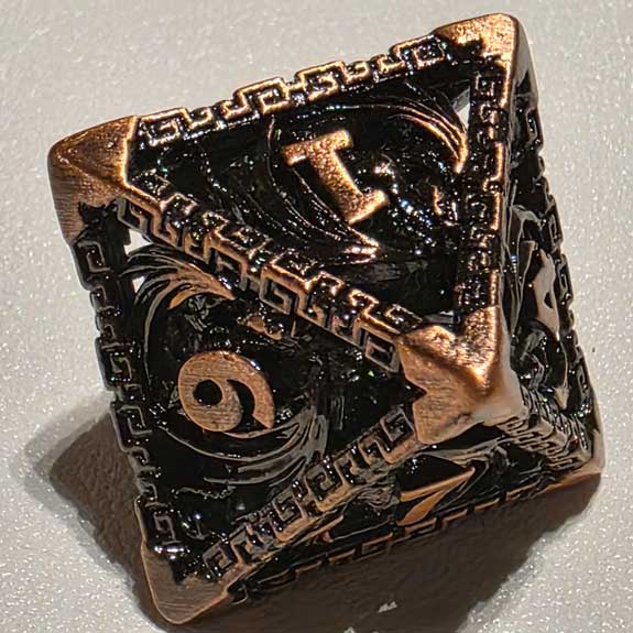 Shadow of the Dragon embodies that quiet menace. Its hollow metal design weaves scaled patterns and sharp edges into a dark, elegant silhouette that seems to move even when still. When rolled, the dice release a low, resonant chime — a whisper of strength waiting to strike.