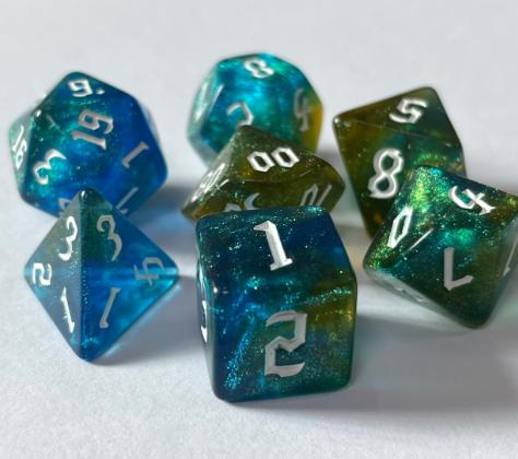 For adventurers who prefer their fate written in the stars and etched in ancient runes, the Sigilic Flux collection weaves cosmic beauty with arcane flair. These dice share the same celestial blend of colour and shimmer as their Astral kin but feature mystical, rune-like numerals that feel pulled from forgotten scrolls. They’re perfect for the wizard with flair, the warlock with style, or anyone who wants their rolls to look like a spell in motion.